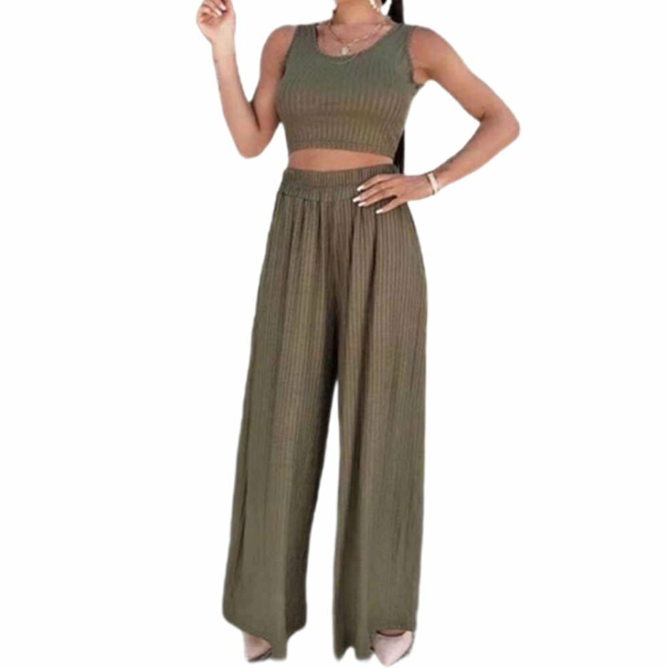 Σετ γυναικείο τιραντέ βαμβακερό με νεανική ριπ ύφανση, αποτελείται από τιραντέ crop top και φαρδιά παντελόνα με πιέτα. Ελαστικό ύφασμα που εφαρμόζει άριστα. Μαλακό λάστιχο μέσης για να μην πιέζει, σε κανονική γραμμή.